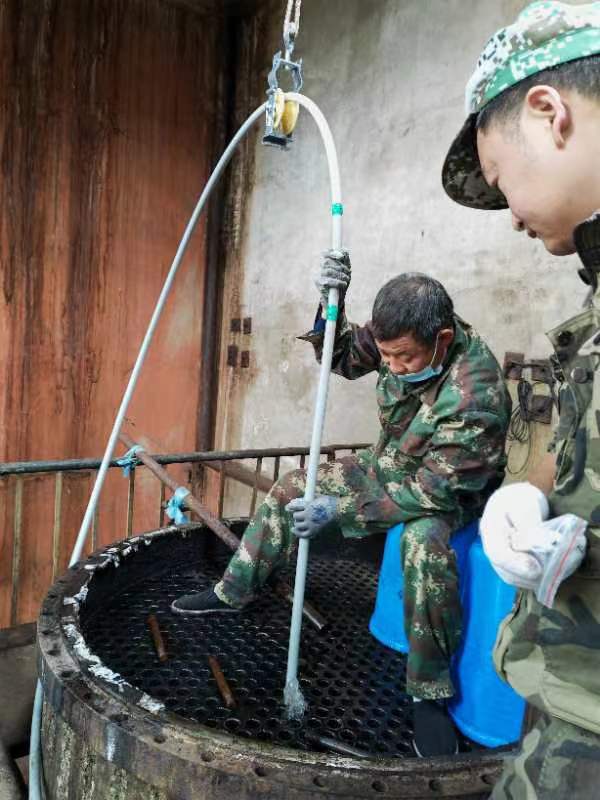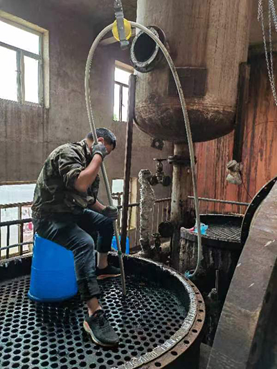 2022年5月28日黑龍江省哈爾濱市呼蘭區(qū)康金鎮(zhèn)小趙村哈爾濱市盛大化工有限公司在費(fèi)總的精心安排下,孫總親自坐鎮(zhèn)指導(dǎo),生產(chǎn)廠長(zhǎng)潘峰與河南都市機(jī)械設(shè)備有限公司喬主任,都紅植技師密切配合,徹底了解GQ-600型智能清洗機(jī)的性能和特點(diǎn),使用600型智能清洗機(jī)四個(gè)要點(diǎn)1,不能缺水,要使用干凈的靜水,2,過載保護(hù)扭力限制器要調(diào)到,軟軸跳動(dòng)可以自動(dòng)停下來,不然既不安全,又失去他的意義,3,軟軸要放平拉直,順勁擺放,不能打死彎,盡可能防止扭軸斷軸,4,鉆頭要大小適當(dāng),太大了容易卡軸扭軸斷軸,并且一定要直對(duì)疏通管道口。三天時(shí)間打通清洗了兩臺(tái)徹底堵死好、結(jié)垢堅(jiān)硬的污水蒸發(fā)器,廢水蒸發(fā)器,沒有損壞一根軟軸,沒有損壞一個(gè)鉆頭和配件,為糠醛行業(yè)增加了自信,減少了資金損耗,降低成本,提益,做出了標(biāo)桿!