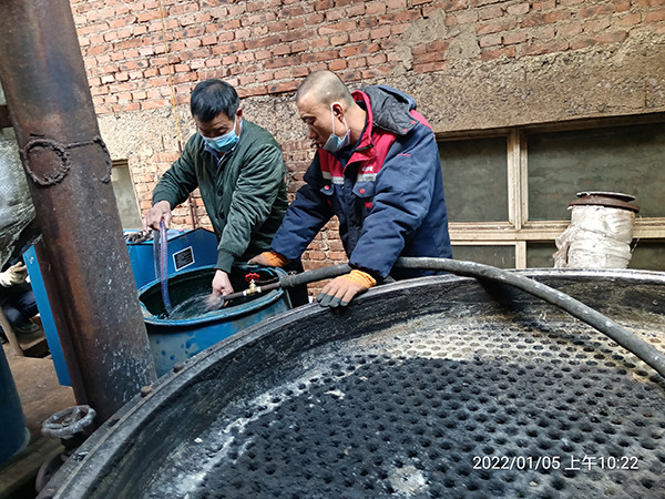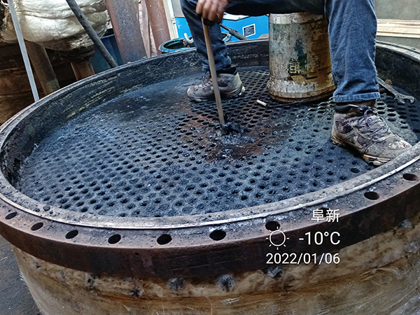 2022年1月24日星期一,虎年(農(nóng)歷臘月二十二)大寒季節(jié),室外時溫零下—16℃,遼寧省彰武縣興隆山鄉(xiāng)老虎坨子村,阜新市彰武縣達凱化工有限公司糠醛廠,在高經(jīng)理的精心安排下,蘇振山廠長給我們指導(dǎo),積極與我們河南都市機械設(shè)備有限公司喬俊陽技術(shù)員配合,改制了一款寬槽橡膠滑輪,對結(jié)垢堅硬,徹底燒干堵死的廢水蒸發(fā)器管子進行疏通,清理,經(jīng)過實驗,既節(jié)省了人力,又安全,又快捷,確實是值得分享的好辦法!