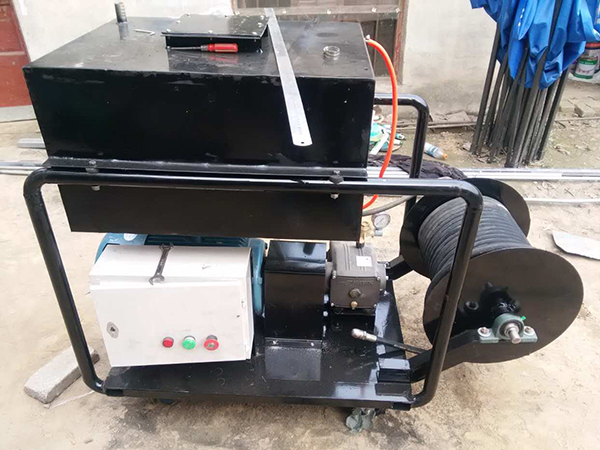 其工作原理為:以汽油機(jī)或電動(dòng)機(jī)為動(dòng)力驅(qū)動(dòng)高壓泵運(yùn)轉(zhuǎn),利用高壓水射流在噴頭上產(chǎn)生的推力疏通管道,當(dāng)噴頭到達(dá)管道時(shí),膠管在卷管器拉力(或人力)作用下強(qiáng)制后移,此時(shí)高壓水射流來清理管壁并將雜物帶到管外,以達(dá)到清洗管道的目的。